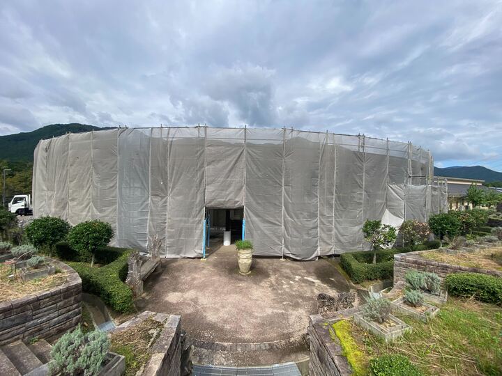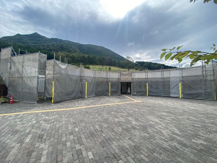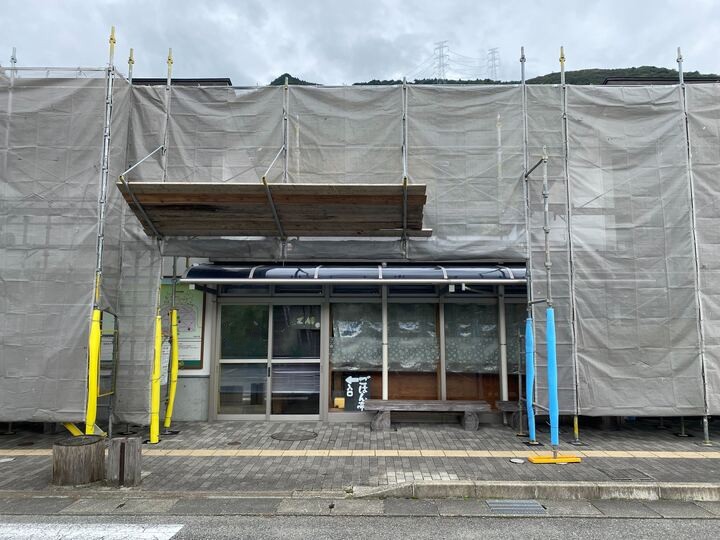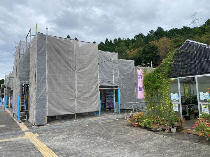 ごはん亭・ショップ・事務所建物周辺に工事用足場を設置しております。